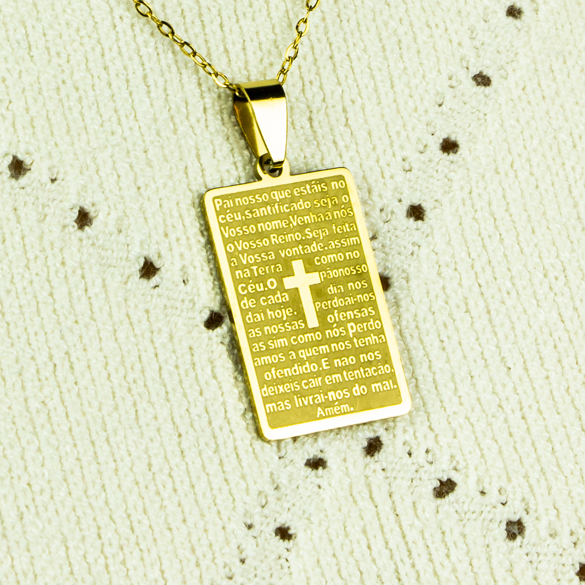 Com design elegante e acabamento dourado, este colar traz a poderosa oração do Pai Nosso gravada na plaquinha, sendo um símbolo de espiritualidade para carregar junto ao coração.
