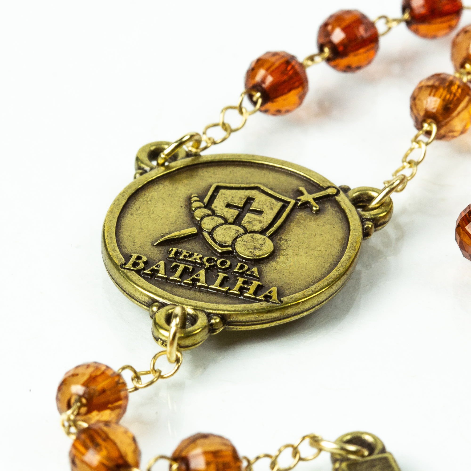 1 Terço da Batalha, produzido com 7 grupos cada um com 7 contas de pedras irisadas, entremeio, com a gravação da Arca da Aliança, e cruz em ouro velho em um dos lados e do outro o logo do Terço da Batalha, acompanha uma caixa em acrilico com o brasão do Terço da Batalha.