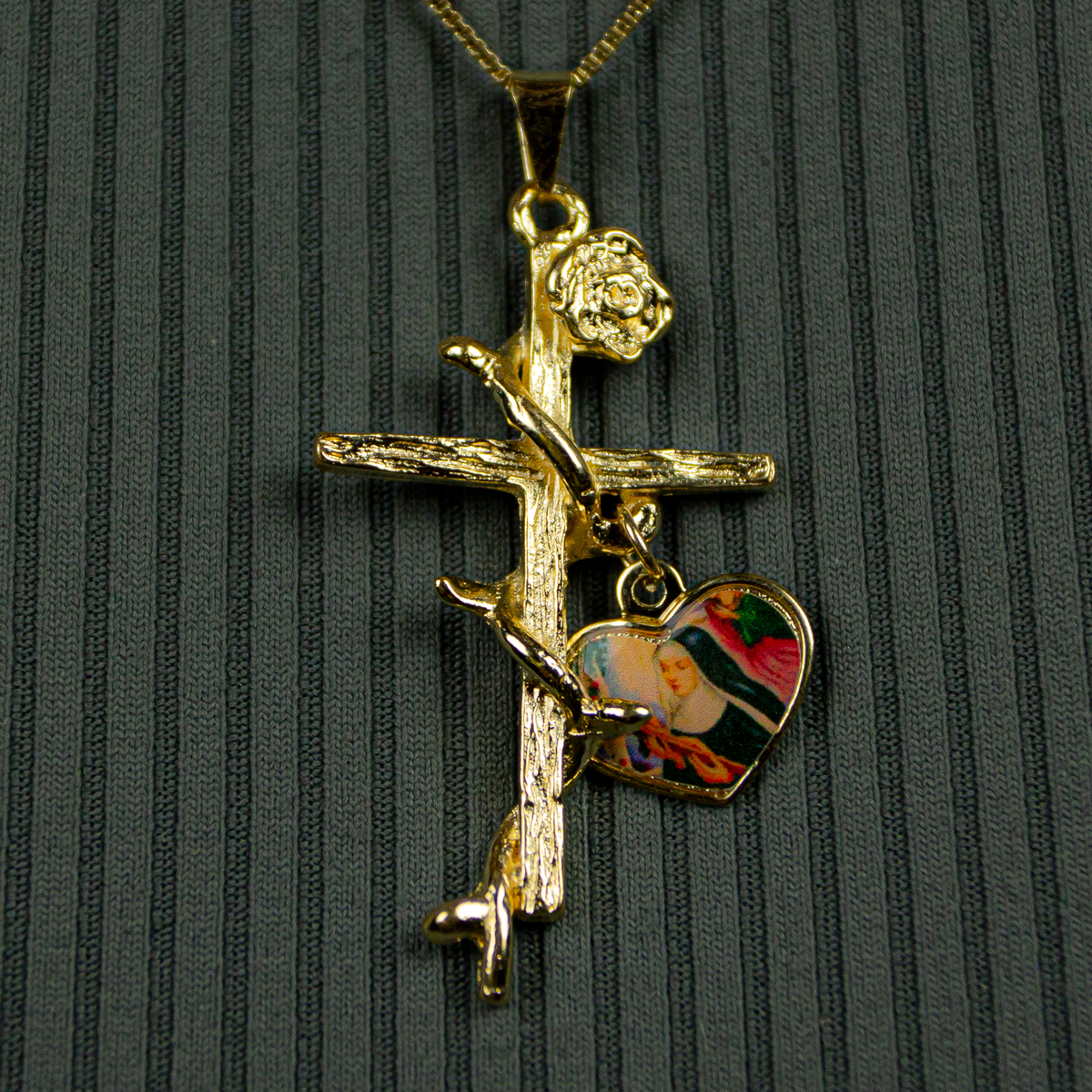 Este encantador pingente semijoia é uma peça cheia de significado e espiritualidade. Combinando a cruz e o coração, ele traz a imagem de Santa Rita de Cássia, conhecida como a santa das causas impossíveis e da intercessão em momentos de dificuldade. A cruz simboliza o sacrifício e a fé inabalável, enquanto o coração representa o amor, a compaixão e a devoção profundos que marcaram a vida de Santa Rita.